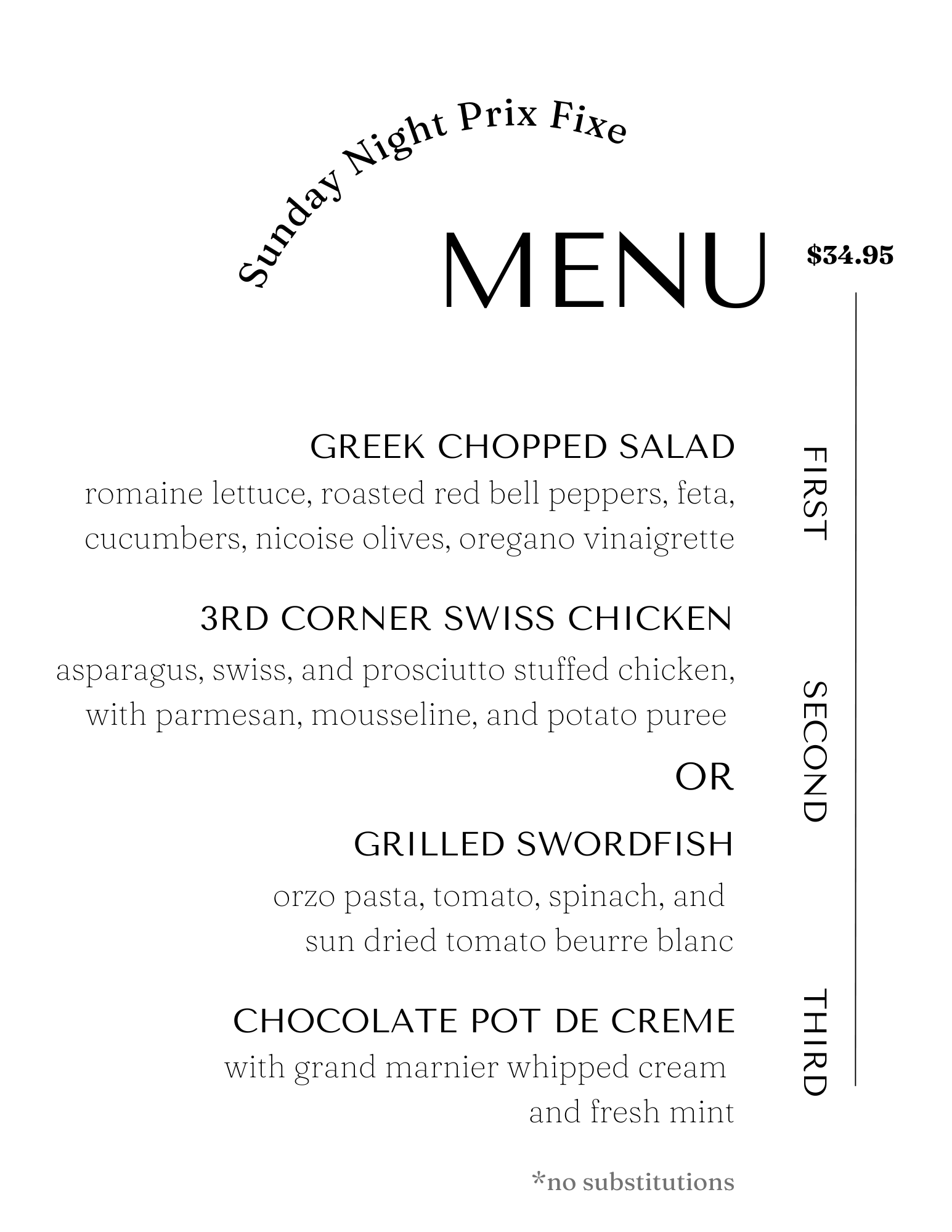 Sunday Prix Fixe Dinner Menu!2.1.263 Courses for $34.99*Prix fixe starts at 3pm!Always optional, but always so good.