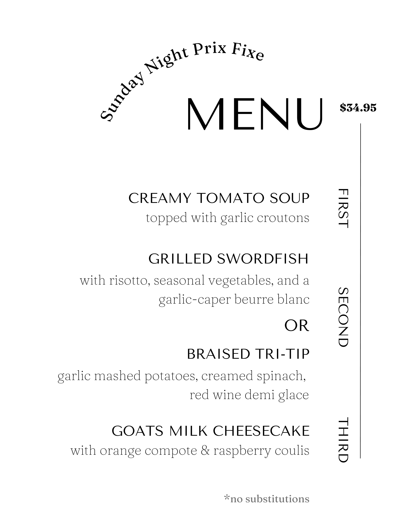 Sunday Prix Fixe Dinner Menu!12.28.253 Courses for $34.99*Prix fixe starts at 3pm!Always optional, but always so good.