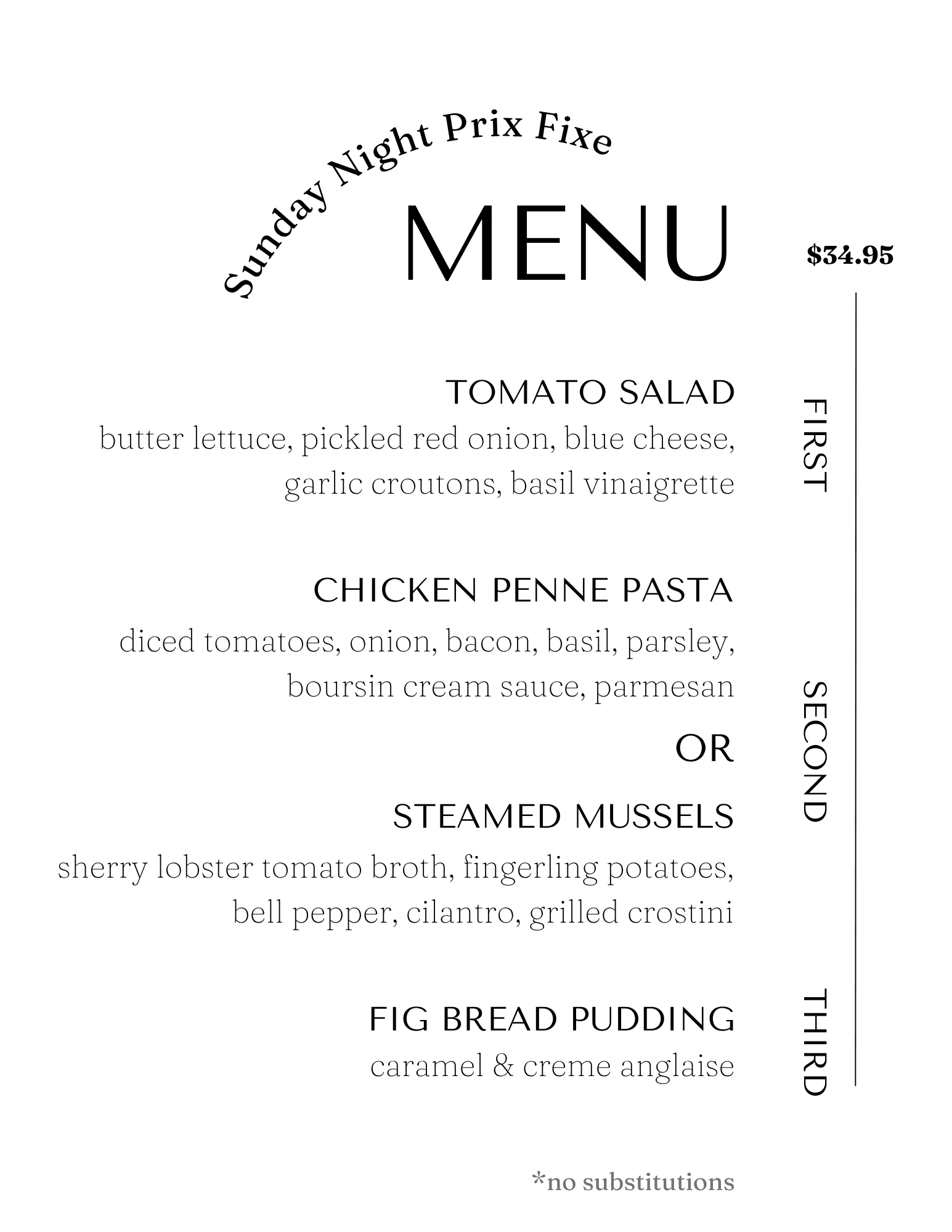 Sunday Prix Fixe Dinner Menu!4.12.263 Courses for $34.95*Prix fixe starts at 3pm!Always optional, but always so good.